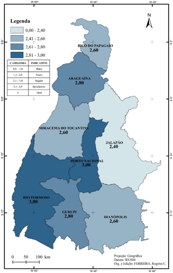 The application of Idsed had as a space cut the strategic division of the eight microregions of Tocantins, made by the IBGE in 1990, being: Araguaina with 17 municipalities, Bico do Papagaio with 25 municipalities, Dianópolis with 20 municipalities, Gurupi with 14 municipalities, Jalapão with 15 municipalities, Miracema do Tocantins with 24 municipalities, Porto Nacional with 11 municipalities and Rio Formoso with 13 municipalities, totaling 139 municipalities (Figure 1). In addition to better targeting regional inequalities in education, this division considers the condition of physical-territorial and socioeconomic homogeneity of the regions.
