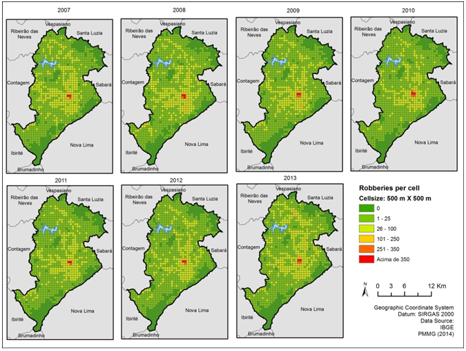 Among the violent crimes, robberies are highlighted by the quantity of events, a criminal mode in which the agent uses violence or serious threat to subtract the property of its victims. The results of the spatial distribution of robberies in Belo Horizonte from 2007 to 2013 are shown in the map collection below (Figure 2):