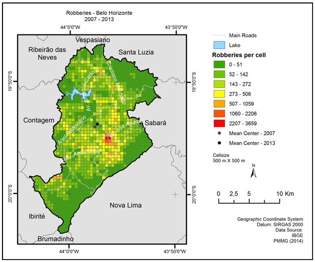 Figure 2 Spatial distribution of the robberies in Belo Horizonte (2007 - 2013)