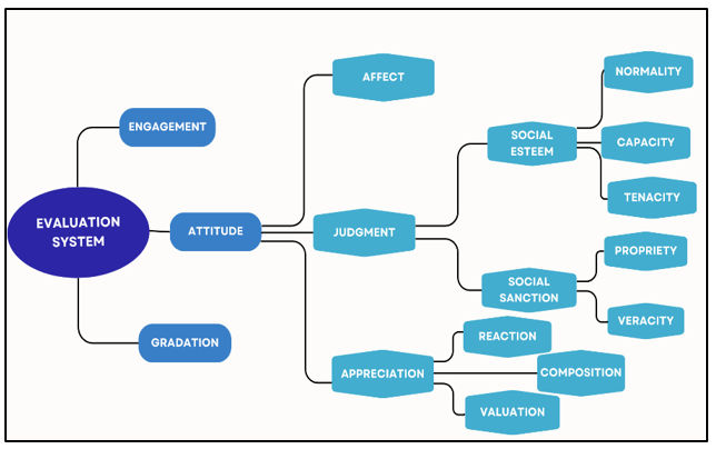 Figure 2 below highlights the Attitude subsystem, helping to better understand the types and subtypes within the categories of Judgment and Appreciation.