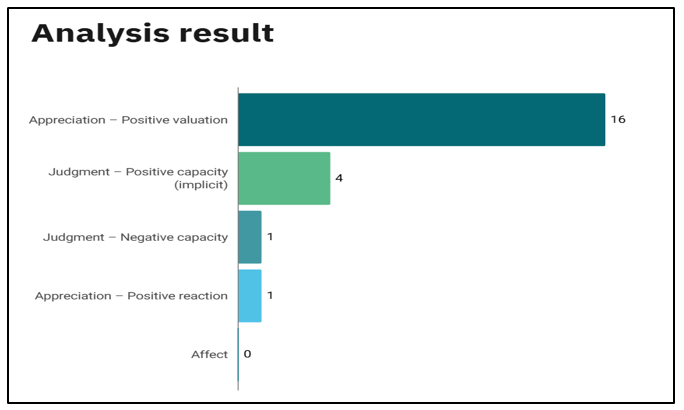 Based on the chart, we can observe the predominance of positive Appreciation – Valuation, reflecting positive evaluations about the value and effectiveness of CLIL implementation in educational contexts. Judgment of Social Esteem – positive Capacity (implicit) appears as the second most frequent element, with four occurrences, showing that the value attributed to the approach is linked to its impact on students’ skill development. Meanwhile, Appreciation – positive Reaction and Judgment of Social Esteem – negative Capacity were each identified once, indicating that the authors of the analyzed articles focused their evaluations mostly on value-based aspects of the approach.