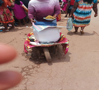 The above picture presents a woman carrying cooked food in a one-wheel truck, she moves around in the market and serve food to those willing to buy. This makes access to her client very easy. On the other hand, she might not find it easy with the tax collectors who may want her to pay some token before having access to the market space.