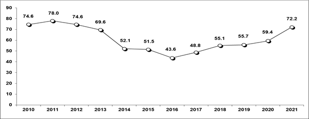 It could be calculated starting from 2010, when this social income was granted to people of the third age, who had no income or was much too small to support themselves. The ratio was high between the years 2010-2013, between 74.6%-78.0%, during the rest of the time interval it was positioned at the value of 50-55%, until the year 2020. The year 2021 marks a return of the ratio at 72.2%, as it was at the beginning of the time frame (Figure 1).
