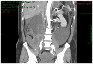 Figure 1: Abdomen CT-scan with contrast that reported organized hematoma along the right iliac branch associated to intraperitoneal serous-hematic fluid.