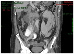 A 54-years old Caucasian man affected by sub renal aortic aneurysm, undertake vascular surgery of aortotomy and bilateral aortoiliac Dacron prosthesis implantation. Patient had a good health status; he had hypertension (with good control of blood pressure), diabetes mellitus type 2. He had no operations. In the past. In 5 post-operative days, due to post-operative anaemia, fever and slight increased creatinine (around 1.3 mg/dl), the patient received an ultrasound scan that showed intra-retroperitoneal fluid without any sign of hydronephrosis. In the suspect of haemorrhage, vascular surgeons performed an abdomen CT-scan with contrast that reported organized hematoma along the right iliac branch associated to intraperitoneal serous-hematic fluid (Figure 1). CT-scan did not have delayed phases. In XII post-operative day, patient was transferred to intensive care ward because of fever until 39°C, dynamic ileus and uremic status. He received an abdomen contrast CT-scan that showed increasing of intra-retroperitoneal fluid with small bowel and right colon compression and increase of right iliac region serous-hematic fluid (Figure 2).
