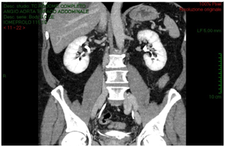 The CT-scan, targeted to a suspect of hemorrhage, did not have delayed phases. Patient received paracentesis with around 3200 cc fluid drained that was sent to microbiological examination. Result of bacteriological exam revealed infection by Proteus Mirabilis and he received target antibiotic therapy with resolution of septic status. In XXII post-operative day, for a progressive increase of serum creatinine we decided to perform an Uro-CT scan. The exam showed reduction of intraperitoneal fluid, right iliac side fluid collection with contrast enhancement during delayed phases; right ureter was not visible under fluid collection (Figure 3). We attempted to insert a ureteral stent in retrograde way but ureter resulted totally interrupted inside the fluid collection so the patient was undergone to explorative laparotomy and toilette of fluid collections. We found ureteral loss of substance of around 3 centimeter localized in anterior ureteral wall. We manufactured end-to-end ureteral anastomosis after positioning of ureteral stent seven French. We removed ureteral stent after 3 months and currently the patient is in follow-up with a good renal function as shown at last CT-scan after 10 months (Figure 4).