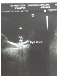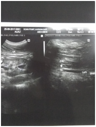 All patients who reported within 1-2 days of ureteric colic were examined, and subjected to Haemogram, KFT, Urine examination, Ultrasound and NCCT Scan (Figure 1&2) to document ureteric calculi at the time of colic with respect to location, side and size of the stone. Age and sex of the patient was noted down and SOADS regime was started for a period of 4 weeks maximum after which this MET was stopped. The routine follow up examination were performed, using the same tools to evaluate the success of the treatment after every week till 4 weeks of study period. Patients were instructed to discontinue the study medication after spontaneous stone expulsion and date of expulsion is to be recorded. For patients without stone in urinary tract on final USG/NCCT but unnoticed stone expulsion, the date of last positive stone status is to be recorded (Figure 3). For the children the dosage of the SOADS regime was half the dosage. Two - three litres of fluid which consists of Lemon juices, Oranges juices and clear water or Tea. This regime was continued for 2 weeks after which again assessment was made and if the stone did not pass then it was continued for another 2 weeks. Treatment was considered successful when stone was expelled within 4 weeks. After 4 weeks, patients who did not pass the stone were advised to undergo minimally invasive surgery depending upon the stone size and location.