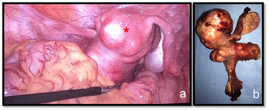 Figure 4 Videolaparoscopic view of the tumor indicated by a red asterisk (A). Surgical specimen (B).