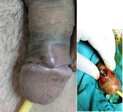 Penile Gunshot injuries are seldom seen in India. The diagnosis and management depend upon the weapon caliber, type, and distance from a firearm. Success in the treatment of penile lesions from gunshot wounds depends on early surgical exploration, debridement of the wounded structures and primary lesion repair.2–4 Bullet injuries usually present with extensive trauma to tissue. Detailed history and examination is done. The physical examination of the Penis is best for diagnosis. Bullet injuries to Penis are associated with urethral injuries and Corporal injuries.5 For penetrating penile trauma, the physical examination is sufficient for evaluation. The patients having hematuria are evaluated with Retrograde urethrography. Patients having bullet injuries are explored and debridement with preservation of maximal tissue is done. Partial injuries of urethra are managed with careful catheterization and complete injuries Suprapubic catheterization is done. Patient having penetration into tunica albuginea are repaired primarily.6,7