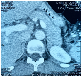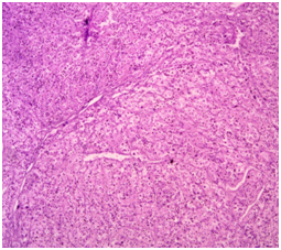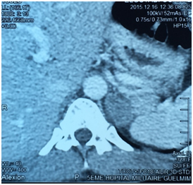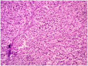 E.O. was a 31-year-old female, with a history of celiac disease under gluten-free diet, and a pregnancy-induced hypertension one year ago, without having been screened for secondary hypertension, to the best of our knowledge. A satisfactory blood pressure (BP) has been reached under treatment with nicardipine (100mg/day). The patient was admitted to our hospital because of headache, muscle weakness and heart palpitations, for two weeks. On physical examination, the patient was in regular general condition and with a healthy coloring. Her weight was 53.5 kg and height 162 cm (BMI=20.41Kg/m2). Blood pressure measured with a manual armlet 190/110 mmHg, heart rate 100beats/minute and regular, respiratory rate 18cycles/min, body temperature 36.9°C. On auscultation, her lungs were clear with no rales. Her heart auscultation showed regular cardiac rhythm with cardiac sounds of normal intensity and no murmurs. Her lower limbs showed symmetric palpable pulses and no edema. The power and sensation of both lower and upper limbs were normal. The abdominal examination showed hydro-aerial noise, no visceromegaly and no abdominal murmur. Thyroid gland examination was normal. There was neither obesity nor hirsutism. Other physical examination was normal. Laboratory findings were as follows: serum potassium 1.68mEq/L (normal range (NR)= 3.5-5.1), sodium 143 mEq/L (NR=136-145), alkaline reserve 32mEq/L(NR=22-31), corrected calcium 95mg/L(NR=86-100), phosphorus 29.9mg/L (NR=25-45), urea 0.15g/L (0.13-0.45), creatinine 3.9mg/L(NR=5-9). The complete blood count and coagulation indices were normal. The thyroid function test was normal (0.94mU/L; NR=0.27-4.2). The measurements of sodium and potassium in the 24-hour urine were 54mEq/L (NR=54-190) and 63 mq/L (NR=25-125), respectively. The ECG showed presence of changes of hypokalemia, U waves and no hypertension changes. Echocardiography assessment of hypertension was negative, and there was no hypertension retinopathy. She was treated with boluses of intravenous potassium chloride and oral potassium supplements, for 260 mmol/day over 6 days. Initially her hypertension was treated with intravenous nicardipine utilizing an electrical syringe pump. Despite intravenous and oral potassium supplementation, her serum potassium level remained low. The PA was suspected because of persistence hypokalemia in association with hypertension and alkalosis. However, after correction of serum potassium level, the patient was examined for the plasma aldosterone concentration (PAC) and direct rennin concentration (DRC). Results revealed a low DRC level of 0.9mUI/L (NR=2.8-39.9), along with a very high PAC level of 2613pmol/l (NR=83-405). The aldosterone to rennin ratio (ARR) was 523pmol/l per mUI/l (N<64). Subsequently, after a three-day oral sodium load, 24-hour urine was tested for the concentration of sodium (260mmols) and aldosterone (27.3mg). Abdominal computerized tomography (CT) revealed a 28x21 mm hypo-dense mass (1UH of density), not enhanced by the contrast product, over the left adrenal gland (Figures 1) (Figures 2). After using spironolactone 100 mg/day and nicardipine 150 mg/day for one month preoperatively, the BP normalized (BP=125/85 mmHg), the headache, weakness and heart palpitations significantly improved, and the serum level of potassium was 4.5 mEq/L. Therefore, the patient underwent a successful laparoscopic left adrenalectomy (Figure 3), and the postoperative course was well. The macroscopic tumor consisted of an ovoid piece of yellow color tissue with weight: 28gr, circumscribed mass: 20x30mm in dimensions adjacent to adrenal tissue. Histologically, the adrenal mass showed an encapsulated epithelial neoplasia with cells of clear cytoplasm, round nuclei and conspicuous nucleoli. However, necrosis, capsular invasion and atypical mitosis were not found (Figure 4). The anatomic pathological diagnosis was adenoma of the adrenal gland consistent with Conn’s adenoma. The patient was normotensive and serum potassium was 4.5mEq/L without any antihypertensive medication or supplement for the last three months after discharge. She was stable with a optimal control of blood pressure without hypokalemia with a 2-year follow-up.