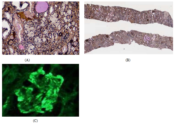 A 26-year-old male, active bodybuilder, accidently discovered low hemoglobin level when he was donating blood, his HB was 8 g/dl and serum creatinine 12 mg/dl, BUN 118 mg/dl and metabolic acidosis PH 7.2, and serum bicarbonate was 14 mmol/l. No previous medical history, his sister known to have systemic lupus (SLE). Renal us done and revealed average size kidneys 8x5 cm with grade III hyper-echogenicity, urine analysis was unremarkable, Patient gave positive history of anabolic steroids intake, creatine supplements consumption, high protein diet, and he was using energy drinks for rehydration. Immunological work up including anti-neutrophilic antigen (ANA), C3, C4, ESR, CRP all came normal. Renal biopsy included up to 19 glomeruli, all of them globally sclerosed. Tubular atrophy and interstitial scarring affect about 90% of the cortical area. Surviving proximal tubular epithelium shows cytoplasmic protein reabsorption droplets and hypertrophic changes focally. Five small arteries are included that show fibro-intimal thickening. Thrombotic microangiopathy is not seen Figure 1(A) & Figure (B). Immunofluorescence Microscopy showed sections stained for Albumin, Fibrinogen, C1q, C3, IgG, IgM, IgA, Kappa light chain & Lambda light chain. There is positivity for C3 (3+) in sclerosed glomeruli. Traces of mesangial IgM are seen in sclerosed glomeruli. Other immune-stains are negative except for IgA positivity of hyaline casts and positivity for IgM, IgA, Kappa and lambda chains in atrophic tubular basement membranes Figure 1(C). Electron microscopy was not conclusive as all glomeruli were sclerotic in the specimen [Biopsy pathology processing and analysis was done at Express Med laboratories, Kingdom of Bahrain]. He received normal strength saline (77 meq sodium bicarbonate in one-liter ½ NSS) at rate of 2 ml/kg/hour, urine output was satisfactory 1300-1600 ml/day. After two days of IV fluids serum creatinine showed partial improvement from 12 to 10 mg/dl and BUN 118 to 98 mg/dl. In view of the partial improvement of kidney function and possibility of patchy kidney sclerosis, we started the patient on low dose oral steroid dose with monitoring of kidney function. After two weeks, no response to steroids was observed, patient was declared to have end stage renal disease (ESRD) and prepared to initiate regular hemodialysis and kidney transplantation option was discussed with the patient.