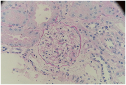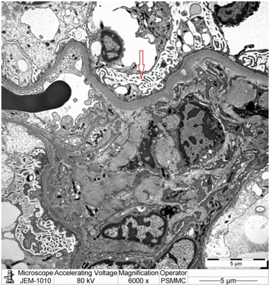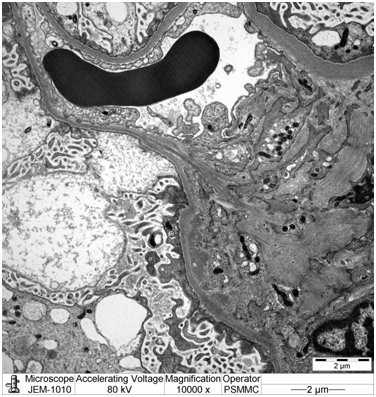 Electron microscopy: Sections stained with Toluidine blue stain showed the renal cortex containing 16 glomeruli, none globally sclerotic. Ultrastructure evaluation showed diffuse epithelial foot processes effacement with microvillus proliferation, mild amounts of electron dense deposits in the mesangial region. The glomerular basement membranes were normal thickness (Figure 2&3).