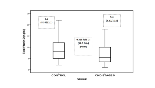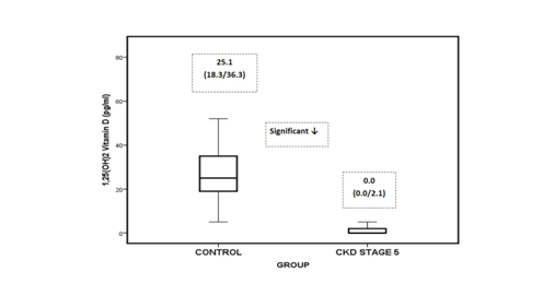 After the enrolment of patients in the study, blood and urine samples were collected for routine biochemical tests (Blood Urea Nitrogen (BUN), Creatinine, Calcium (Ca) Phosphorus (P) from serum and microalbuminuria from urine). Medication of vitamin D and calcium were stopped for fifteen days of these dialytic CKD patients. After this washout period, on 16th day which was considered as the first day of recruitment, blood and urine samples were again collected and routine biochemical tests were repeated. iPTH, 25(OH) D (total vitamin D/ calcidiol), 1, 25(OH)2 D, total and intact FGF-23 (iFGF-23) and bone alkaline phosphatase (BALP) levels were also analyzed. These patients were again prescribed calcium and vitamin D treatment on the basis of the renal profile analyzed subsequent to the wash-out period of the above said medications. Thus, study population included 48 dialytic CKD patients and 66 controls. These dialytic CKD patients were then followed up for a period of six months.