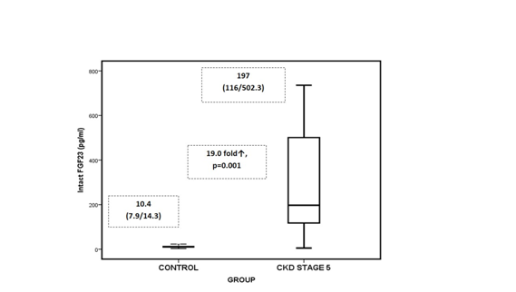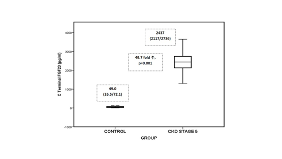 Conclusion: Marked accumulation of inactive C-terminal FGF-23 might provide new insights in understanding the role of FGF-23 and hyperphosphatemia in CKD stage-5 patients.