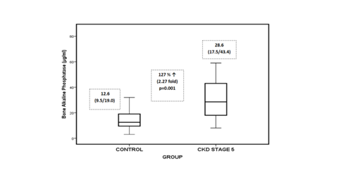 Table 1 shows the demographic data of dialytic CKD patients at the time of the recruitment. Weight and BMI of the dialytic CKD patients were significantly low compared to the age matched controls (Table 1). BUN (5.21 fold) and creatinine (7.0 fold) of these CKD stage 5 patients were significantly (p=0.001) high as compared to controls (Table 2). Phosphorus (50.8%, p=0.001), calcium-phosphorus product (52.3%, p=0.001) and iPTH (8.4 fold, p=0.001) levels in dialytic CKD patients were significantly higher than in their age matched controls (Figure 1-3). 1,25(OH)2D levels were almost nil in these patients and 25(OH)D were significantly lower (32.5%, p=0.01) as compared to the controls. Total FGF-23, iFGF-23 and C terminal FGF-23 were significantly (p=0.001) higher by 44.5, 19.0 and 49.7 fold respectively in dialytic CKD patients as compared to controls (Figure 4-6). The increase in the C-terminal FGF-23 by iFGF-23 in controls and patients were 4.7 and 12.4 fold respectively. As compared to the controls, BALP levels were significantly higher (2.27 fold [127%], p=0.001) in these CKD stage 5 patients (Figure 7). A positive correlation was observed between P and iFGF-23 (Spearman correlation, rs = 0.317, p=0.028) in dialytic CKD group. In the present study, phosphate binders prescribed to the patients were either Lanthanum Carbonate (Fosbait 500mg) or Sevelamer (Sevacar 400mg). There was no significant difference in the phosphate or calcium phosphorus product levels observed when CKD patients were divided into two groups as per the phosphate binders used (Data not shown).