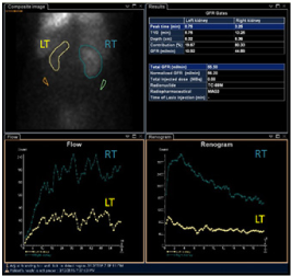 Figure 1 Poor perfused left kidney (LT) with poor excretion of TC-99m compared to right kidney (RT) on isotope renogram.