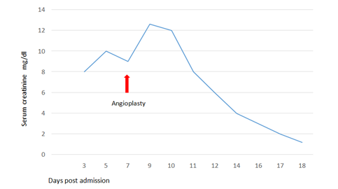Balloon angioplasty was done followed by stent insertion to maintain renal artery dilatation (Figure 2B). Patient was referred back to ICU; and blood pressure started to be under control by oral antihypertensive medications only. However, patient became anuric, hemodialysis sessions maintained to control fluid overload and improve general condition, serum creatinine reached 12.6mg/dl. Hemoglobin 8.6g/l but with no evidence of bleeding, erythropoietin was not initiated because of hypertension. In the following days blood pressure improved dramatically that enabled successful weaning of antihypertensive medications, urine output started to increase with spontaneous drop of serum creatinine without performing hemodialysis. In two weeks, blood pressure was maintained at systolic 120mmHg/80mmHg diastolic without antihypertensive medication with normal serum creatinine 1.1mg/dl and hemoglobin 11g/l on discharge from hospital (Figure 3).