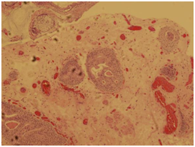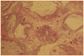 A complete blood count, liver function test, urine culture and PSA were all within normal ranges. Urine cytology revealed atypical cells. CT abdomen and pelvis with I.V contrast showed a 3.1 x 2.4 x 3 cm polypoidal mass of the trigone (Figure 1). Afterwards, the patient underwent cystoscopy which showed a solid florid mass extending from the trigone to the posterior wall of the urinary bladder, TURBT was carried out. The Histopathology slides showed cystitis cystica with cystitis glandularis (Colonic metaplasia) (Figure 2‒5).