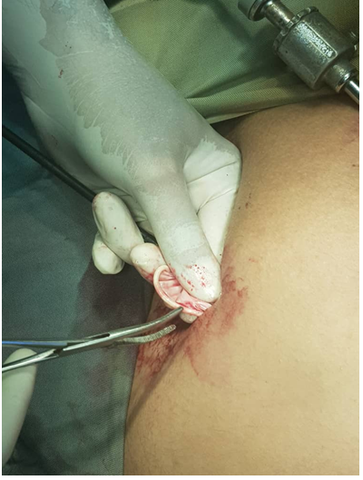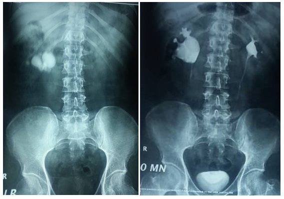 45 years old male patient came to urology outpatient complaining of recurrent right flank pain for several months, no fever or hematuria, no significant medical or surgical history. Physical examination was unremarkable, serum creatinin 1.1mg/dl , urine analysis showed microscopic hematuria, urine culture was negative, ultrasound reveals multiple right renal stones with dilated extrarenal pelvis, plain x ray & intravenous pyelography performed Figure1 (A & B). All treatment options explained to the patient and after discussion he elected to undergo laparoscopic peylolithotomy. Transperitoneal laparoscopic pyelolithotomy was performed in lateral position with Rt. Flank tilted 45 degrees using 4 ports. multiple renal pelvis and calyceal stones extracted and putted in a bag made of No 6 surgical glove (Figure 2) after closure of the pyelotomy by intracorporeal sutures the bag containing the stones extracted through the umbilical port after enlarging it (Figure 2), during extraction the bag was broken and some stones escaped to the abdomen. Another bag replaced and most of the stones extracted searching for the remaining stones in the abdomen was frustrating and we decided to terminate the procedure and closing the port sites. The post-operative course is unremarkable and patient discharged in fifth post-operative day. Follow up plain x-ray after one month revealed tow round stones with 30 and 10mm maximum diameter lying deep in the pelvis (Figure 3), after discussion with the patient about the possible complications of those stones he agree to underwent open extraction by low midline incision and stones extracted.