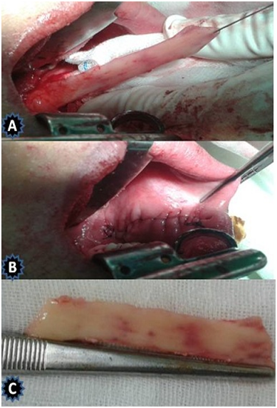 In all cases, after preparation of the urethra and recognition of the size of the needed graft, the same team moved to harvest the graft. The donor site was prepared, and then cleaned using a solution containing 10% povidone-iodine, and the Boyle Davis mouth gag was used to optimize exposure in some patients. Stay suture was applied to the external edge of the graft to keep the oral mucosa stretched. The Stensen’s duct was identified and the desired graft size was measured and marked in an ovoid or rectangular shape. Then, 5 ml. of 0.5% adrenaline (1:200,000) was injected submucosal along the lateral borders of the graft site, to facilitate and enhance hemostasis. The graft was configured according to the desired width and length. The oral mucosal graft was harvested by dissecting the mucosa off the buccinator muscle. The oral mucosal donor site was inspected for bleeding and the defect was closed using a running or interrupted 4-0 polyglactin sutures. When necessary (for longer strictures) an extra graft was taken from the other cheek. The donor site is packed with a piece of gauze which is removed in the ward (Figure 2). The graft was held for defatting over the surgeon’s finger, and then the graft was placed in saline with Gentamycin solution and left ready for usage. In all cases, after graft harvesting, the same team rescrubbed and moved to the perineum.