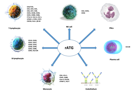 Rabbit ATG is a polyclonal lymphocyte depleting antibody that contains a wide variety of antibody specificities: immune response antigens, adhesion and cell trafficking molecules, and molecules involved in various pathways. The exact mechanism of immunosuppressive action not fully elucidated; appears to include clearance of peripheral antigen-reactive T lymphocytes (T cells) and modulation of T-cell activation, homing, and cytotoxicity. Although rATG has been shown to deplete a variety of immune cells, the primary mechanism of action is T-cell depletion. rATG also modulates cell surface expression of adhesion molecules and chemokine receptors, thus interfering with leukocyte-endothelial interactions that play a role in ischaemia/reperfusion injury (IRI) [27]. It is also has a wide range of anti-B cell actions as illustrated below in Figure 1.