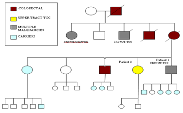 This patient's 52 year old younger sister presented later with right upper tract urothelial carcinoma (UTUC) in her right pelvis. Ureteroscopic biost revealed TCC T1HG disease. After receiving neoadjuvant chemotherapy (Gemctibine + Cisplatinum) imaging showed a near to complete response in the renal pelvis and paraortic mass. She underwent a right nephroureterectomy with modified lymph dissection which showed no evidence of disease. Genetic investigation revealed a Q158X mutation on MSH2 Gene consistent with the diagnosis of Lynch syndrome/HNPCC (hereditary nonpolyposis colorectal cancer). A family tree of the patients' family is shown in Figure 1. Yamada et al.1 recently reported a similar case of metachronous upper tract TCC associated with hereditary nonpolyposis cancer (HNPCC) requiring radical surgery. Hubosky et al.2 reported that of 13 HNPCC patients treated for upper tract TCC, 6 had bilateral disease.