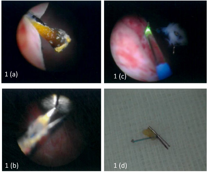As protocol for management of haematuria, we planned for routine blood and urine investigations, flexible cystoscopy and urinary tract imaging. His full blood count, coagulation profile and renal function were normal. His mid-stream urine showed evidence of haematuria but no leukocyturia. His imaging did not reveal any evidence of malignancy. On flexible cystoscopy, anterior urethra and prostatic fossa were normal. Areas of UroLift clips on the prostatic fossa were seen unaltered. At 7 o’clock position on the right lateral side just proximal to the bladder neck one metallic clip was found protruding out towards the lumen of the bladder Figure 1(a). Rest of the bladder was normal with no evidence of any malignancy. We planned for rigid cystoscopy under anaesthesia to remove the metallic clip. With the help of endoscopic forceps (cold-cup forceps) we held the clip and pulled it till the entire clip and a small length of the thread was visible Figure 1(b). We used Holmium laser (1J, 30Hz) to cut the thread flush to the bladder mucosa Figure 1(c). The entire clip with the attached thread was removed Figure 1(d) and haemostasis at the site was secured. We kept urethral catheter overnight and removed the catheter on the next day. He voided well and was discharged. On subsequent telephonic follow-up at one month and three month he was not having any further haematuria or bothersome lower urinary tract symptoms.