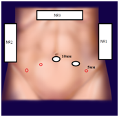 Figure 1 The placement of surgeons and trocars (№1- surgeon, №2- assistant, №3- camera- assistant; red circles - 5 mm trocars; white with black border – 10 mm trocars).
