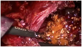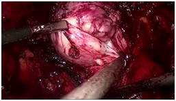 The adenoma dissection along the surgical capsular plane in the same fashion as the open procedure. Once the catheter was identified, the dissection proceeded until the completely adenomatous tissue had been freed. We divided the adenomatous tissue into two lobes (right and left) to ease its dissection and posterior excision. The Foley catheter may be removed for manipulation that is more convenient. The median lobe removed with bladder mucosa. The ureteral orifices must be clear identified. After excision of the adenoma, the specimens were placed in the endobag sack. The bleeding of the prostatic capsule and prostatic fossa was controlled by bipolar or monopolar energy (Figure 3).