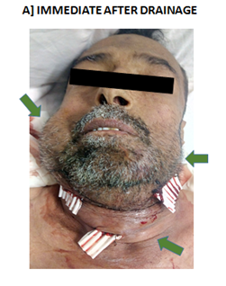 A 56-year-old man kidney transplant since 1996 with decompensated hepatitis C liver disease. Running on triple immune suppression in the form of low dose steroids, Tacrolimus and mycophenolate mofetil. He was admitted with history of dental abscess 3 days ago. Examination shows an acutely ill-appearing man with evident facial edema in the area of the right jaw, no difficulty of swallowing nor acute respiratory distress. Vital signs include an oral temperature of 38.7 C (101.7 F), a heart rate of 90 bpm, and a respiratory rate of 18 breaths/min. Examination of the oral cavity reveals numerous carious teeth, dry oral mucosae, and tinge of jaundice due to decompensated liver disease. Intravenous fluids and intravenous ceftriaxone were started immediately. Three days later patient face has become swollen from his neck to the lower part of her ears, bilaterally. The patient sits upright with his mouth open and his tongue protruding slightly. The floor of the mouth and anterior neck showed woody, tender edema with stiffness of the maxilla-mandibular joint and trismus.