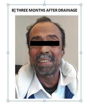 A 56-year-old man kidney transplant since 1996 with decompensated hepatitis C liver disease. Running on triple immunosuppression in the form of low dose steroids, Tacrolimus and mycophenolate mofetil. He was admitted with history of dental abscess 3 days ago. Examination shows an acutely ill-appearing man with evident of facial edema in the area of the right jaw, no difficulty of swallowing nor acute respiratory distress. Vital signs include an oral temperature of 38.7 C (101.7 F), a heart rate of 90 bpm, and a respiratory rate of 18 breaths/min. Examination of the oral cavity reveals numerous carious teeth, dry oral mucosae, and tinge of jaundice due to decompensated liver disease. Intravenous fluids and intravenous ceftriaxone were started immediately. Three days later, the patient suffered face swelling from the neck to the lower part of the ears, bilaterally. The patient sits upright with his mouth open and his tongue protruding slightly. The floor of the mouth and anterior neck showed woody, tender edema with stiffness of the maxilla-mandibular joint and trismus.