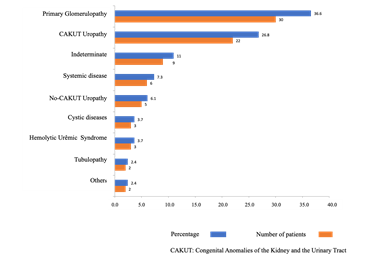 The clinical, epidemiological, social and economic characteristics of the patients are described in Table 1. The majority of children and adolescents (82%) were incidents on RRT, which means that they did not come from another dialysis center. The mother was the main caregiver in most patients (80.5%). Among all patients evaluated, 54 were school-age patients and 46 (85%) reported attending school regularly. As demonstrated in Figure 1, primary glomeronephritis was the main underlying disease, followed by the Congenital Anomalies of the Kidney and the Urinary Tract (CAKUT). During the study period, nine patients died. The causes of death are described in Figure 2. The main cause was sepsis (56.0%).