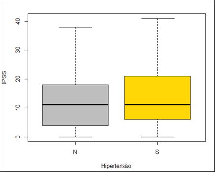Figure 4 International Prostate Symptoms Score (IPSS) values in non-hypertensive (N) and hypertensive (S) individuals. Brasília, DF, 2020. p>0.05.