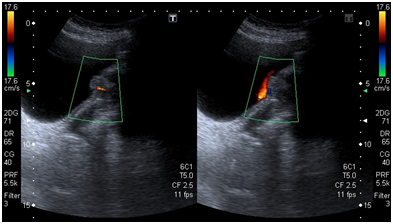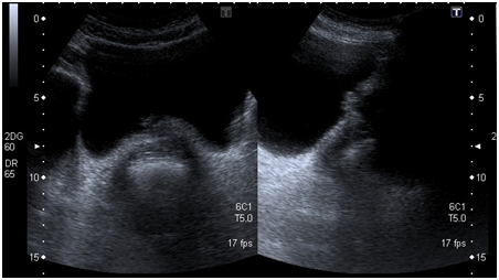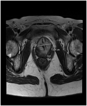 A 54-year old white woman, without significant past medical history other than menopause since 2years ago presented with post coital hematuria and also she had urinary tract infections (UTIs), documented by urine cultures (Proteus Mirabillis). No other associated symptoms. She received antibiotic therapy with quinolones. The urine cytology was negative. The assessment by the Gynecology service was normal. The renal ultrasound (US) Each kidney was normal, preserved cortico medullary differentiation and without dilated collecting systems. There was irregularity zone in the mucosa close to bladder neck, measuring 1x0.5cm. Cystoscopy revealed an edematous and erythematosus lesion of 1x1.5cm in the posterior wall of the bladder neck that extended into the urethra. In pelvic magnetic resonance imaging (MRI) a pelvic mass was evident measuring 35x38x47mm, widening the bladder neck at this level, nonspecific inguinal adenopathies and a left iliac node with malignancy aspect.