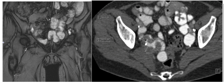 After a month postoperative follow- up she was asymptomatic, no findings in the physical examination. So along with Oncologists, she started adjuvant chemotherapy with cisplatine/Taxol/Gemcitabine (3 cycles) during one month. No other complementary treatment. During one year she had oncologic remission with toracoabdominopelvic scans and physical examinations every 6months without changes. Twenty months after the surgery in the control scan showed a 42x30mm mass in the right pelvic lymphadenectomy area with Ilion infiltration. She also had anemia secondary digestive bleeding. General surgery dismissed curative treatment, for the lesion´s localization and the infiltration of piri for muscle (right ciatic nerve compression). She started chemotherapy CDDP/Gem (6 cycles) and right hemi pelvic radiotherapy (18 sessions, total doses 4500cGy) for pain control. Nowdays, she is finishing the oncology treatment, does not need blood transfusión and also the right leg pain improved.