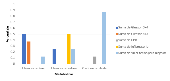The behavior of the different metabolites in the 3D spectroscopy of the prostate contrasted with the suspicion criteria taking into consideration SCORE PI-RADS demonstrated correlation, especially in the nodular areas with suspicion criteria since they presented 87.5% elevation of choline peaks. and in the same percentage there was anatomical-pathological correlation of the findings with PI-RADS and spectroscopy Graph 1.