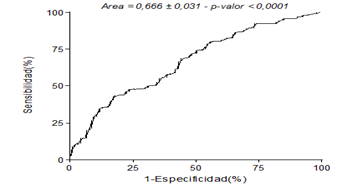 The accuracy of PSA markers to diagnose PCa was analyzed. Figures 1–4 shows the ROC curves and their corresponding Area Under the Curve; demonstrating that the marker that best-enabled identification of patients with PCa CaP was PSAD (66% accuracy) (Figure 1) followed by total PSA (58% accuracy) (Figure 2). Figure 3 and Figure 4 show the curves of F/T PSA index and (F/T)/PSAD, in which lower precision of these markers was observed.
