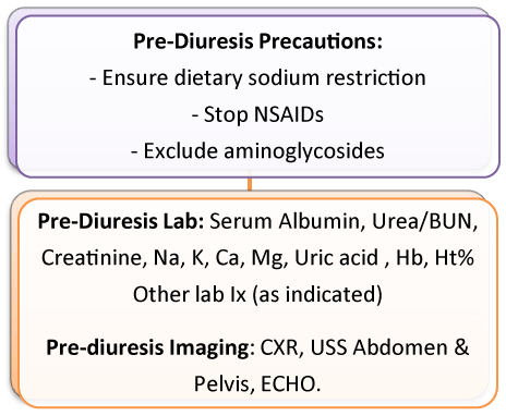 Pre-diuresis imaging: Chest X-ray, ultrasound abdomen and pelvis, ECHO. The idea behind the pre-diuresis investigations is to have a baseline for all the parameters of the patient assessment that will be needed later to follow the response or to detect the side effects of the diuretics.
