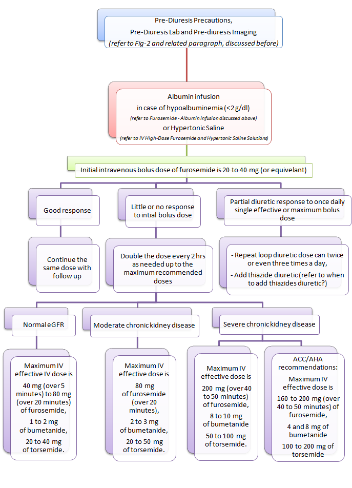 Start IV bolus loop diuretic targeting to reach the single effective dose (mentioned above). The usual initial intravenous bolus dose of furosemide is 20 to 40mg. Next action depends on the response of the patient: