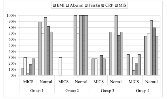 No uniform approach to MICS evaluation has been defined so far. A number of different parameters and models may be used in assessing MICS presence [2,4,5]. Relatively wide range of MICS markers and their variable predictive value result in diversity in interpreting this syndrome. According to the chosen parameters of MICS in our study, the overall MICS prevalence was up to 30%, and the highest incidence of MICS markers was found in patients with highest volume overload. Odds ratio analysis showed higher MICS prevalence in patients with lower BMI. The highest malnutrition-inflammation scores were recorded in patients with volume overload (Group 4). Sensitivity and specificity analysis identified BMI and MIS as the most sensitive markers of MICS in groups 1 and 4. Kalantar-Zadeh et al. [17] also identified MIS as useful, short-term tool to circumvent the need for measuring inflammation markers, CRP or IL6, and risk-stratify HD patients. However, in group 3, the most sensitive marker was serum ferritin, similar to findings by other authors [19]. Patients in this group were youngest, had highest residual diuresis and high IDWG. They could tolerate higher IDWG, suggesting better nutritional status, with less volume overload, thanks to better preserved residual diuresis. All these features contributed to lower possibility for MICS presence in this group, as reported by other authors [11,20].