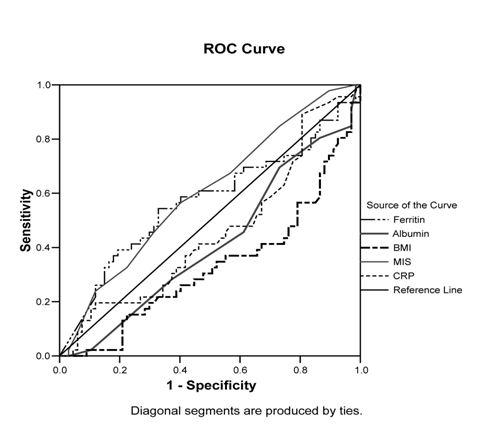 ROC analysis demonstrated that in combination of all five investigated parameters the strongest predictor of MICS in groups 1 and 4 was BMI (Area = 0.699, SE = 0.049, p = 0.000, 95% CI = 0.603 - 0.795 and Area = 0.329, SE = 0.052, p = 0.002, 95% CI = 0.227 - 0.432 respectively), followed by MIS (group 1: Area = 0.399, SE = 0.054, p = 0.053, 95% CI = 0.301 - 0.512; group 4: Area = 0.612, SE = 0.054, p = 0.057, 95% CI = 0.496 - 0.707) (Figure 3). The strongest predictor of MICS in group 3 was serum ferritin (Area = 0.327, SE = 0.063, p = 0.023, 95% CI = 0.205 - 0.45), followed by BMI (Area = 0.357, SE = 0.059, p = 0.051, 95% CI = 0.252 - 0.483). Serum albumin and CRP followed, but with no statistically significant sensitivity and specificity. Small number of patients in group 2 precluded testing for sensitivity and specificity of the chosen parameters of MICS in this group.