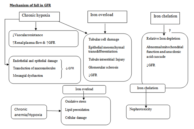 In β-Thalassemia patients, GFR abnormalities are also quite evident manifesting more profoundly in patients of β-thalassemia intermedia who do not require regular blood transfusions and they manifest as increased glomerular filtration rate and creatinine clearance more than the general population.14 The increase in GFR can be explained by the underlying anemia. The glomerular hyper perfusion and the hyper filtration leads to glomerular capillary wall stretching, resulting in endothelial and epithelial dysfunction and injury resulting in transudation of the macromolecules into the mesangium which leads to Mesangial dysfunction and decline in GFR in the long run.15 Hypoxia(due to anemia and increased metabolic need) leads to tubular cell loss by apoptosis or epithelial- mesenchymal transdifferentiation which leads to tubulo-interstitial injury and sclerosis of glomerulo.16 Excess iron causes peroxidation of the tubular cellular membrane causing serious damage of the tubular cells and in response to it the cytokines and growth factors are released that can cause glomerular sclerosis and tubule-interstitial scarring with subsequent fall in GFR.17 The other factors that lead to decline in GFR are the infections, whether related to blood transfusions like Hepatitis C virus, hepatitis B virus, and Human immunodeficiency virus (HIV) infections or the higher propensity for other infections due to chronic anemia, decreased immune response and iron overload which leads to various types of glomerulonephritis.18 The glomerular dysfunction also occurs due to intake of NSAID and use of angiotensin-converting enzyme blockers and angiotensin receptor blockers for associated proteinuria or hypertension present. Similarly, liver failure and cardiac failure, due to multiple transfusions resulting in iron overload in Thalassemia major, is one of the important cause for systemic as well as renal abnormal hemodynamic changes that may eventually lead to renal hyproper fusion and fall in GFR.19