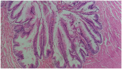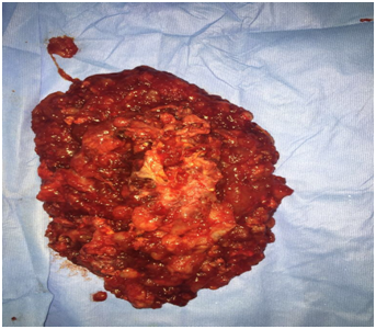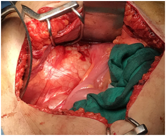 We present here the case of a 50-year-old woman who consulted for a mild right low back pain with palpable abdominal mass since several months. The clinical examination revealed a painless tumefaction of the right iliac fossa (Figure 1). A CT-scan performed showed a large right retroperitoneal cystic polylobed mass, well limited, measuring 15 cm x 10 cm x 9 cm, pushing forward the digestive loops and pushing up the right kidney, containing calcifications, without enhancement after contrast injection, and without evidence of adjacent structures infiltration, evoking a retroperitoneal cystic lymphangioma (Figure 2) and (Figure 3). The patient underwent an exploratory laparotomy, which showed a large whitish retroperitoneal cyst, extending from the right iliac fossa to the right hypochondrium (Figure 4). Given the appendix was not individualized, we suspected then, during surgery, an appendiceal mucocele. During dissection, we assisted to a tumoral rupture, and approximately 500 milliliters of a thick, gelatinous mucoid substance was sucked. The peritoneal cavity was already protected by surgical drape. We went an en-bloc and complete resection of the tumor (Figure 5). The post-operative course were normal. The histological study concluded to a mucinous cystadenoma (Figure 6). After a one-year follow-up, control CT-scans showed no signs of recurrence.