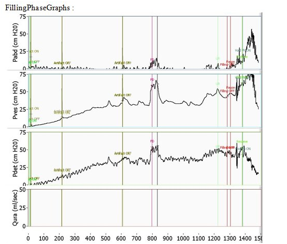 An eleven year old girl was presented to with chronic constipation, persistent dribbling of urine and recurrent urinary tract infections since early childhood. She received treatment by local physicians but remained without proper response. On examination, child was a febrile and her bladder was palpable. Her buttocks were flattened (Figure 1) and external genitalia were wet and excoriated. Anal tone was found decreased on digital rectal examination and the rectum was loaded with hard stool. No definite neurological deficit was found. She was catheterised and stool evacuated with per rectal enema. Her blood analysis showed low haemoglobin (8.1gm %), leucocytosis and raised serum creatinine level (2.2mg %). Urine analysis showed plenty of pus cells and growth of E. coli. Ultrasonography suggested bilateral hydro uretoronephrosis (rt>>lt) with loss of cortico medullary differentiation on right kidney and thickened irregular bladder with significant post void residual urine. Tc-99m DTPA renogram shows poorly functioning right kidney and satisfactorily functioning left kidney. Complete sacral agenesis, 5th lumbar vertebral atrophy and scoliosis with convexity towards right side seen in the control film (Figure 2) while neurogenic bladder with bilateral grade V vesico- ureteric reflux revealed on Voiding phase cystourethrogram (Figure 3). Child was further evaluated with urodynamic study, which suggested an overactive bladder in filling phase (Figure 4). Repeat blood analysis shows (Figure 4) normalisation of serum creatinine (1.2mg %). Her catheter has been removed and she has been placed on self clean intermittent catheterisation along with anti cholinergic (oxy butinine 5mg/daily) and laxative.