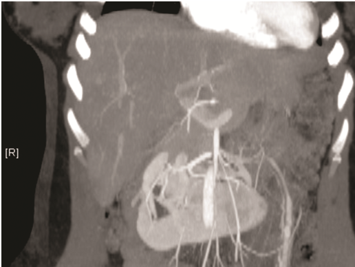 A 28years female with past history of laparoscopic cholecystectomy presented as an emergency with first episode of gross hematuria and clot retention. She was catheterized and bladder irrigation was performed. Serum creatinine was normal. Computerized tomography revealed horseshoe kidney. Cystoscopy and retrograde pyelography was unremarkable. As hematuria persisted, CT angiogram was done which showed hoarse-shoe kidney (Figure 1).