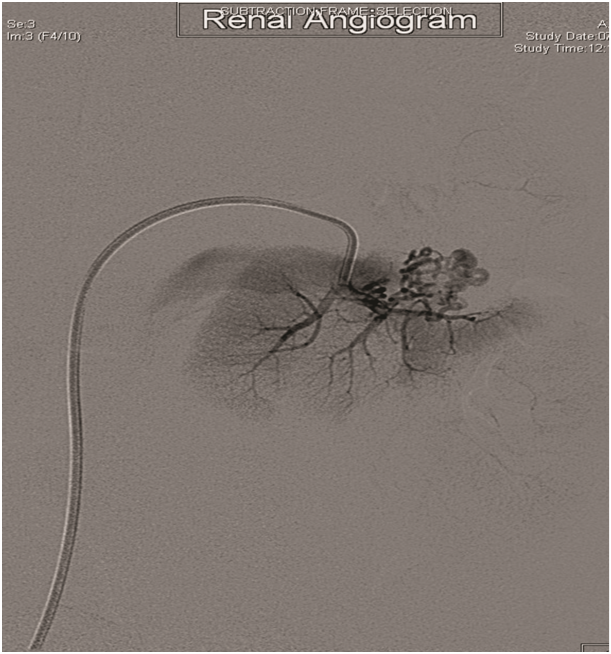 Renal arteriovenous malformations (AVMs) are aberrant connections between the renal artery and vein. They may be acquired or congenital in their aetiology. Arterio venous malformations may present most commonly with gross hematuria .However they may present incidentally or even with congestive cardiac failure and renal insufficiency in large AVMs1,2 AVMs appear as irregular filling defects in the pelvicalyceal system on excretory urography. Three dimensional ultrasound and MR angiography are more accurate findings to detect them than excretory urography and are non-invasive. Selective renal angiography or digital subtraction angiography is most accurate diagnostic tool for AVMs. Treatment options are catheter embolization, balloon catheter occlusion, vascular ligation, partial nephrectomy or nephrectomy.3,4 Nephrectomy was used to be done for AVMs in the past, transcatheter arterial embolization has now become the treatment of choice.5,6 Despite its controversial efficacy of repeated embolization, it is currently the first line treatment for arteriovenous fistulas.7