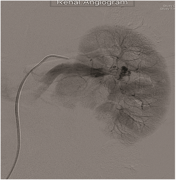 Selective left renal angiography by hand injection revealed a cork-screw like small renal vessels at inter polar region representing nidus of AV malformation with multiple feeding arteries associated with early draining to IVC (Figure 2). Selective embolization of AV malformation was done. Right common femoral artery was accessed with 6Fr sheath and 5Fr guide wire. Different angle angiogram showed multiple feeding arteries. The main Left renal artery feeding branches were occluded by embolizing material Onyx. There were no complications (Figure 3).