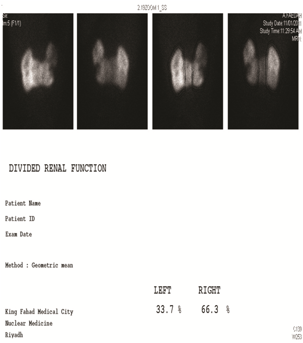 The patient recovered well from the procedure and hematuria was resolved. Follow-up DMSA a year after the embolization revealed moderately enlarged left kidney with thin cortex and large focal defect in upper pole, upper lateral and mid lateral cortex indicating a big scar. And 33.7% of contribution by left kidney to total renal function (Figure 4). At her recent follow up a year after embolization, she was asymptomatic, renal profile was normal and hematuria never recurred.