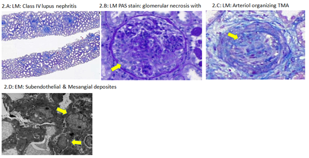 Figure 2 Renal biopsy histopathology: 2(A) LM: Class IV lupus nephritis. 2(B) LM PAS stain: glomerular necrosis with crescent. 2(C) LM: organizing TMA. 2(D) EM: subendothelial & mesangial deposits.