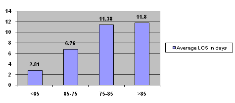 Results: The average length of stay for the overall group was 7.9 days with a large range of 0-85 days. A dramatic rise in length of stay can be seen as age increases, specifically over the age of 75.